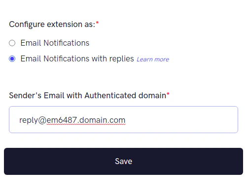 To start using Email Notifications with Replies, you need to first enable and save the settings for Email Notifications extension. Learn more. Once it is set up, you can come back and proceed from here.