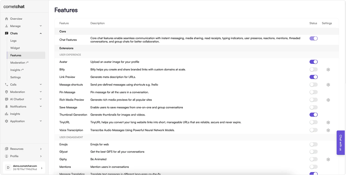 • Webhooks faciliate real-time event-driven communication with your system, enabling you to receive HTTP POST requests from CometChat that carry details about different events.