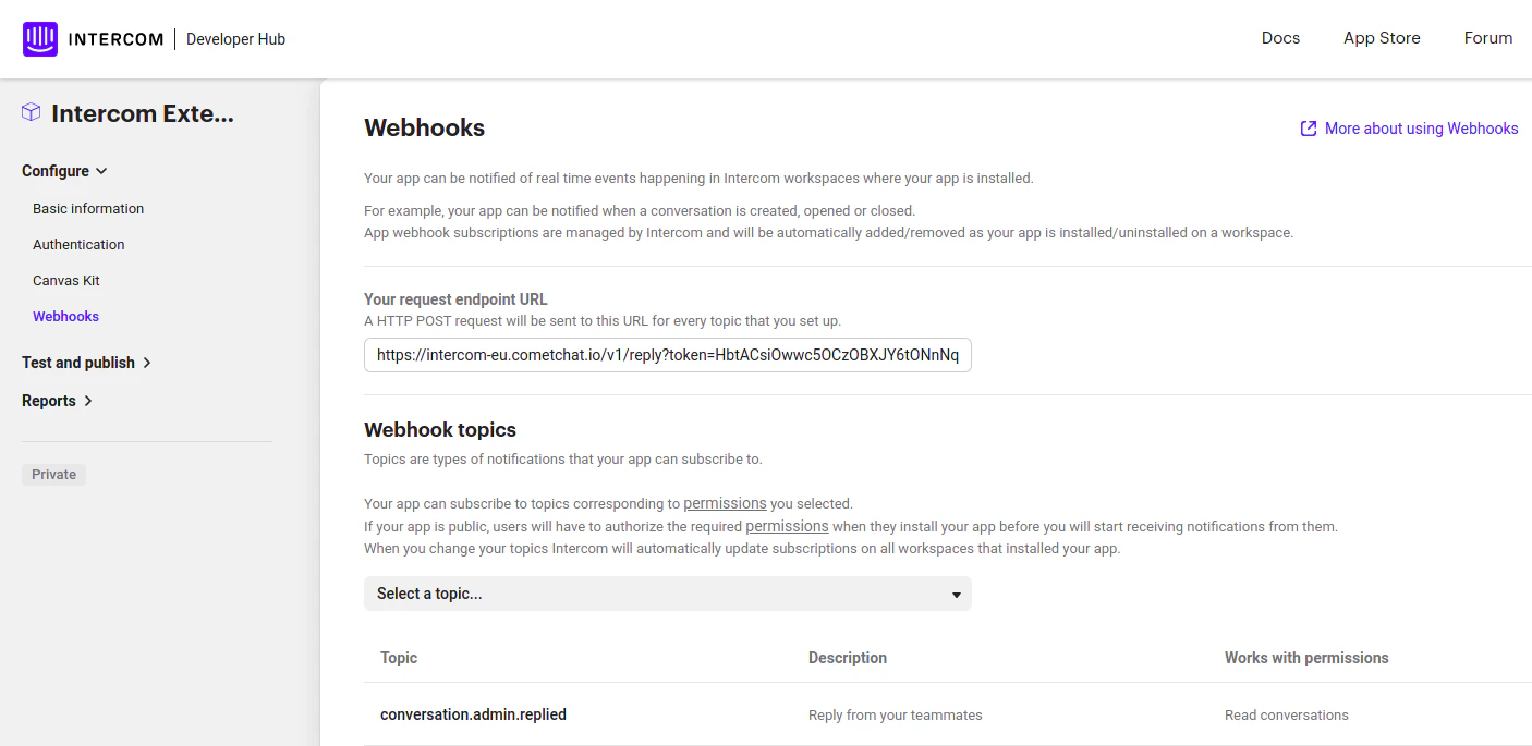 - Copy the above auto-generated Webhook URL and paste it in the Webhooks section on the Intercom Developer Hub.