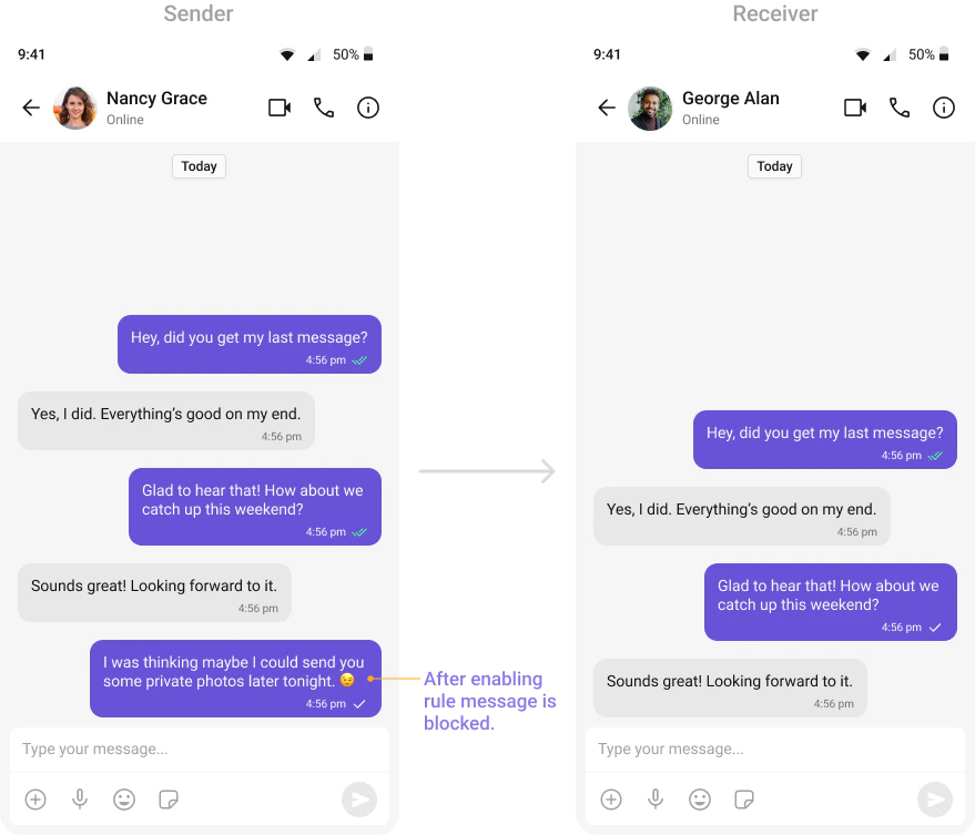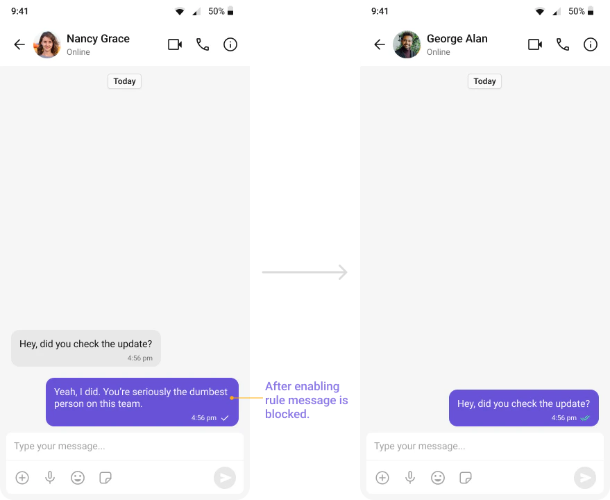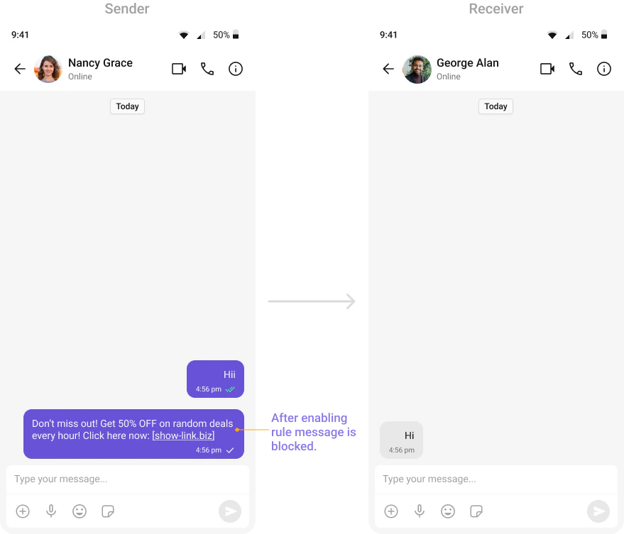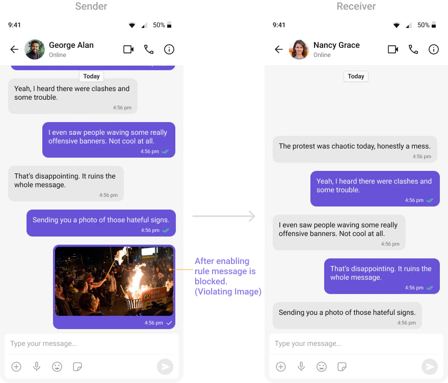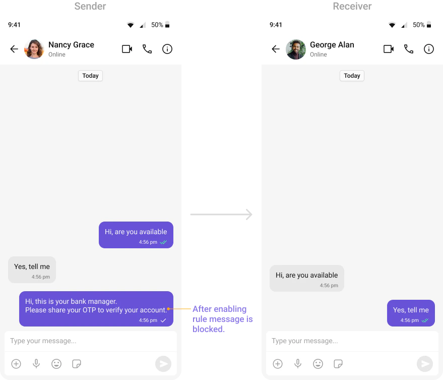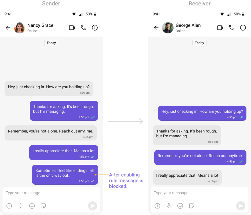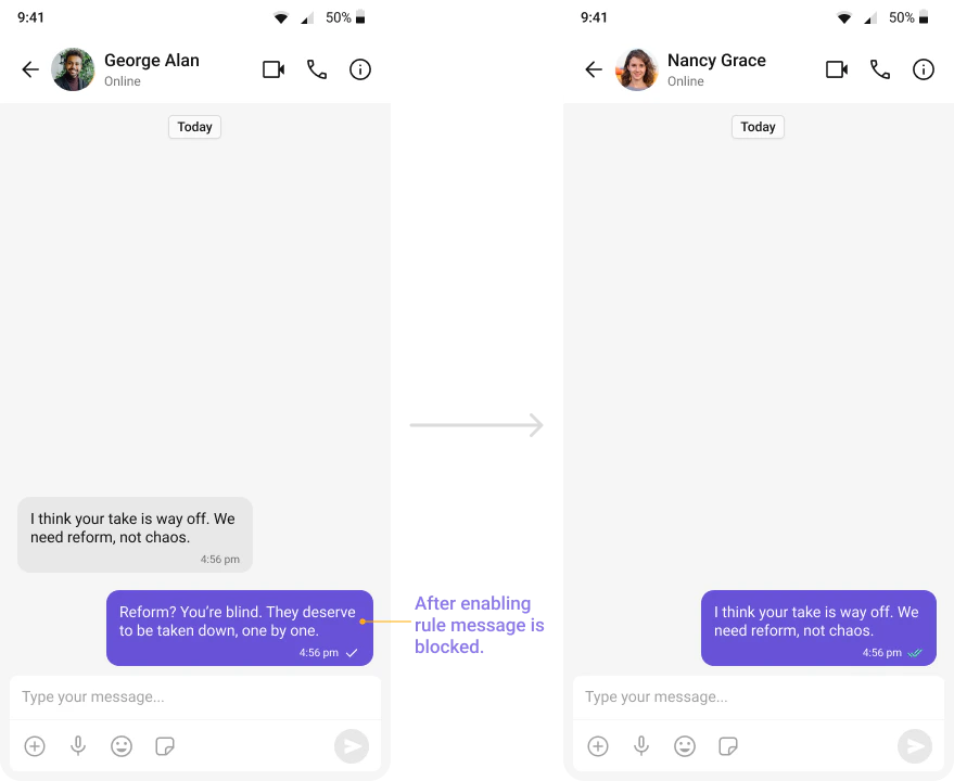 Automatically detects and blocks messages containing offensive language, profanity, or derogatory remarks using a predefined list of offensive keywords.Example: Before enabling, profane messages are delivered (double ticks). After enabling, they’re blocked (single tick).