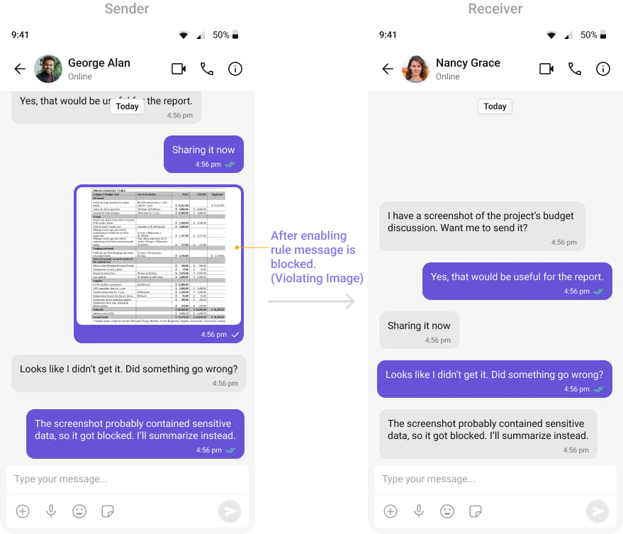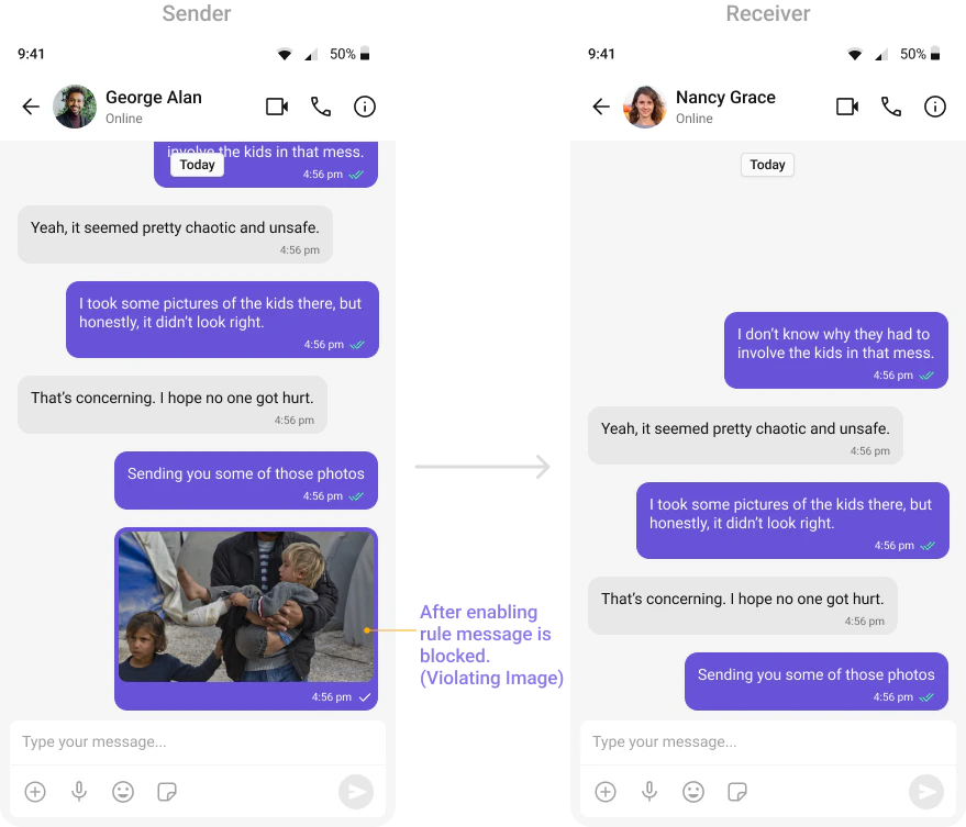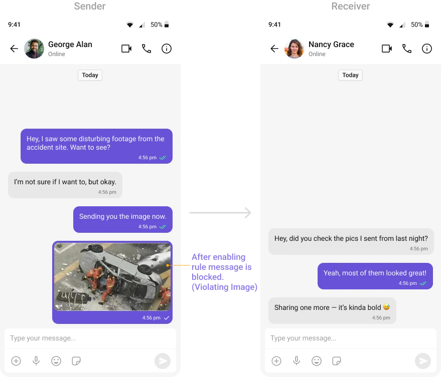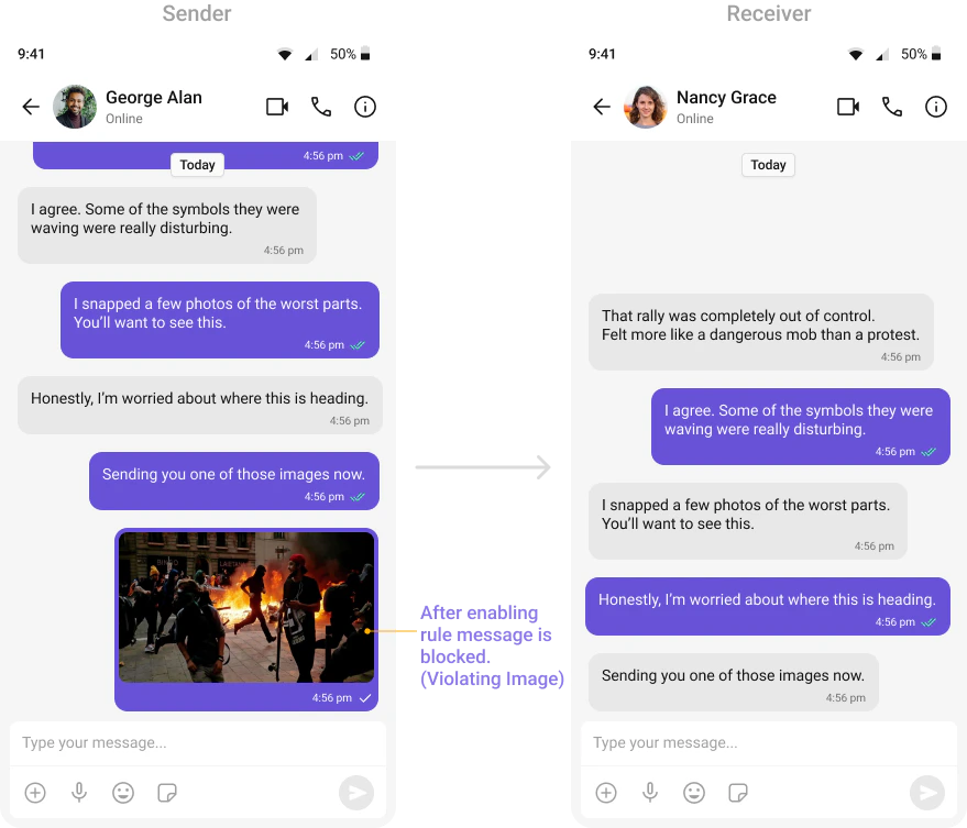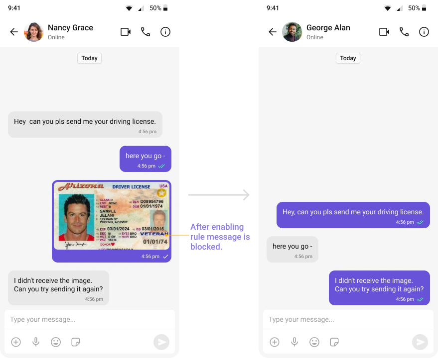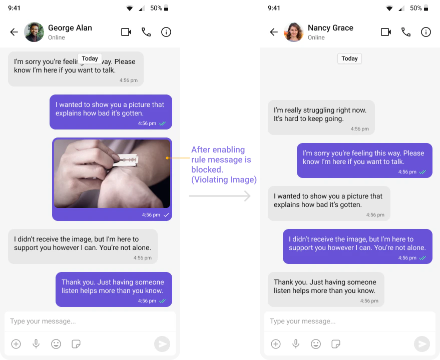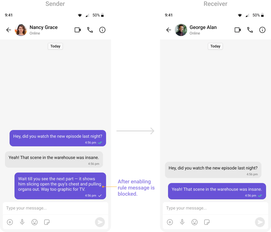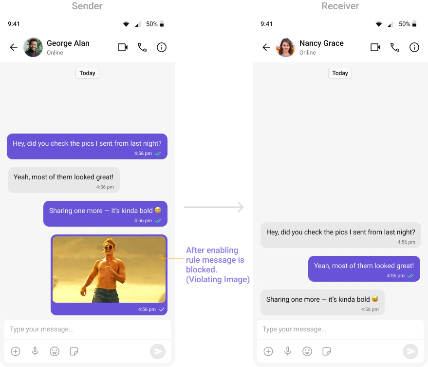 Automatically detects and blocks messages containing offensive language, profanity, or derogatory remarks using a predefined list of offensive keywords.Example: Before enabling, profane messages are delivered (double ticks). After enabling, they’re blocked (single tick).
