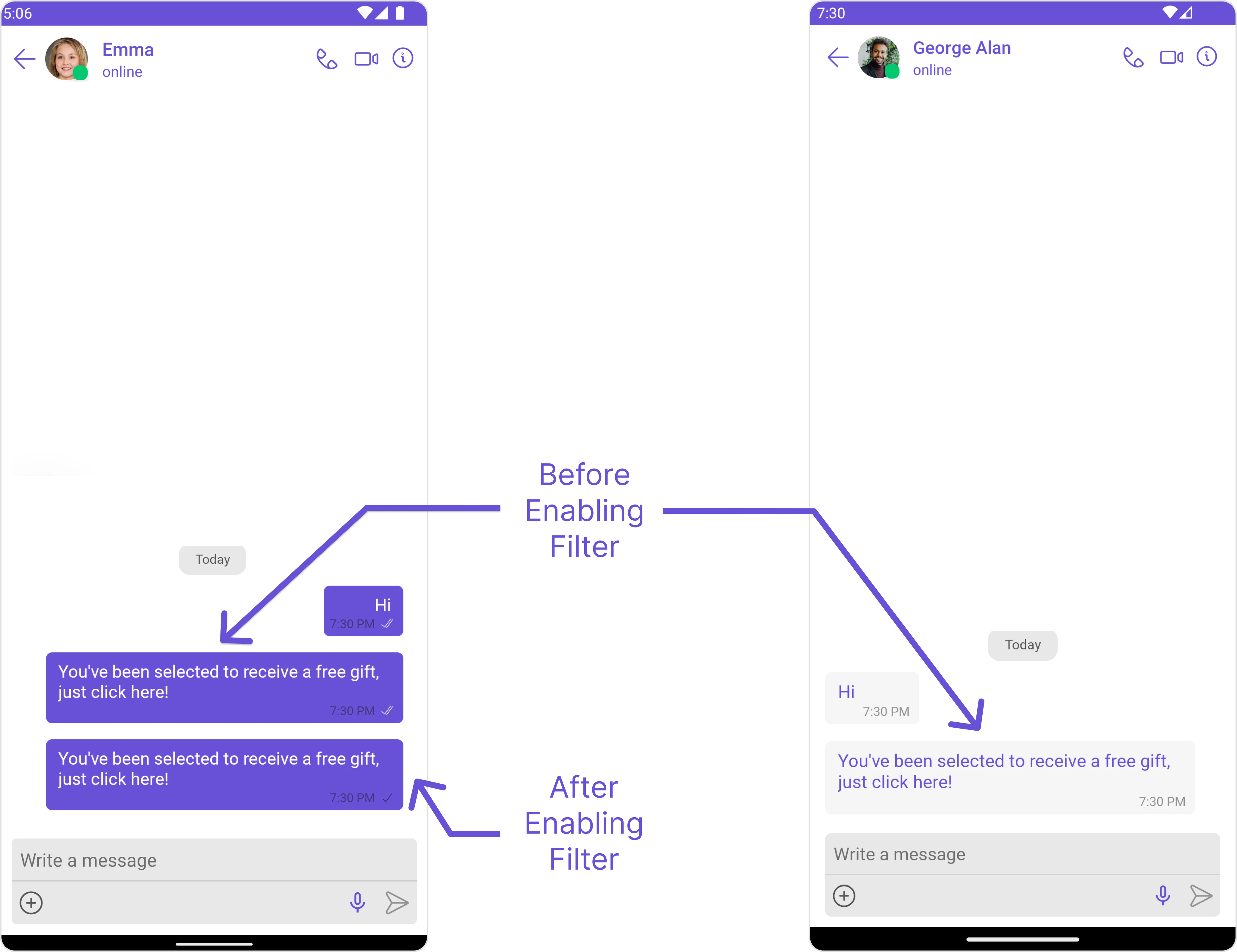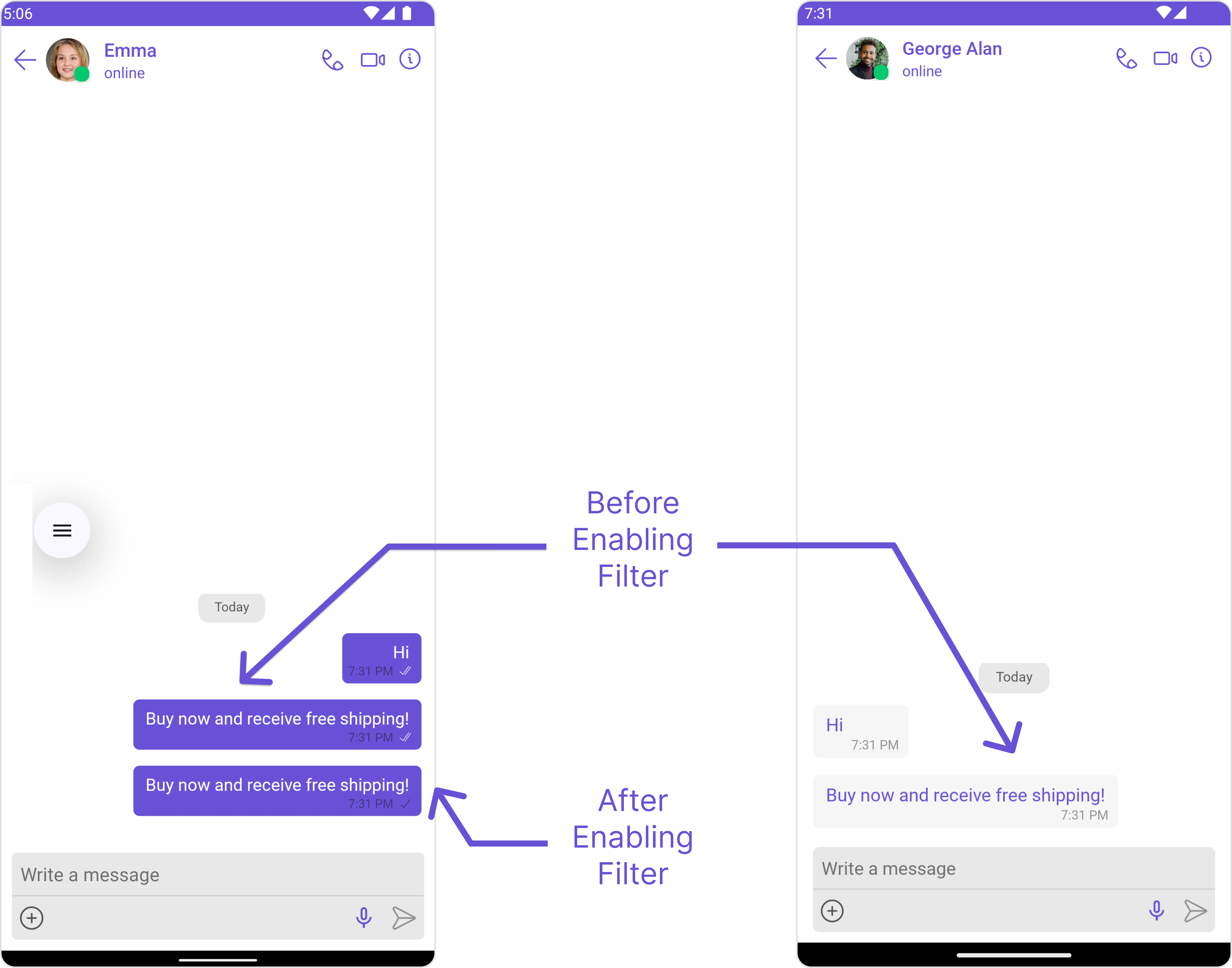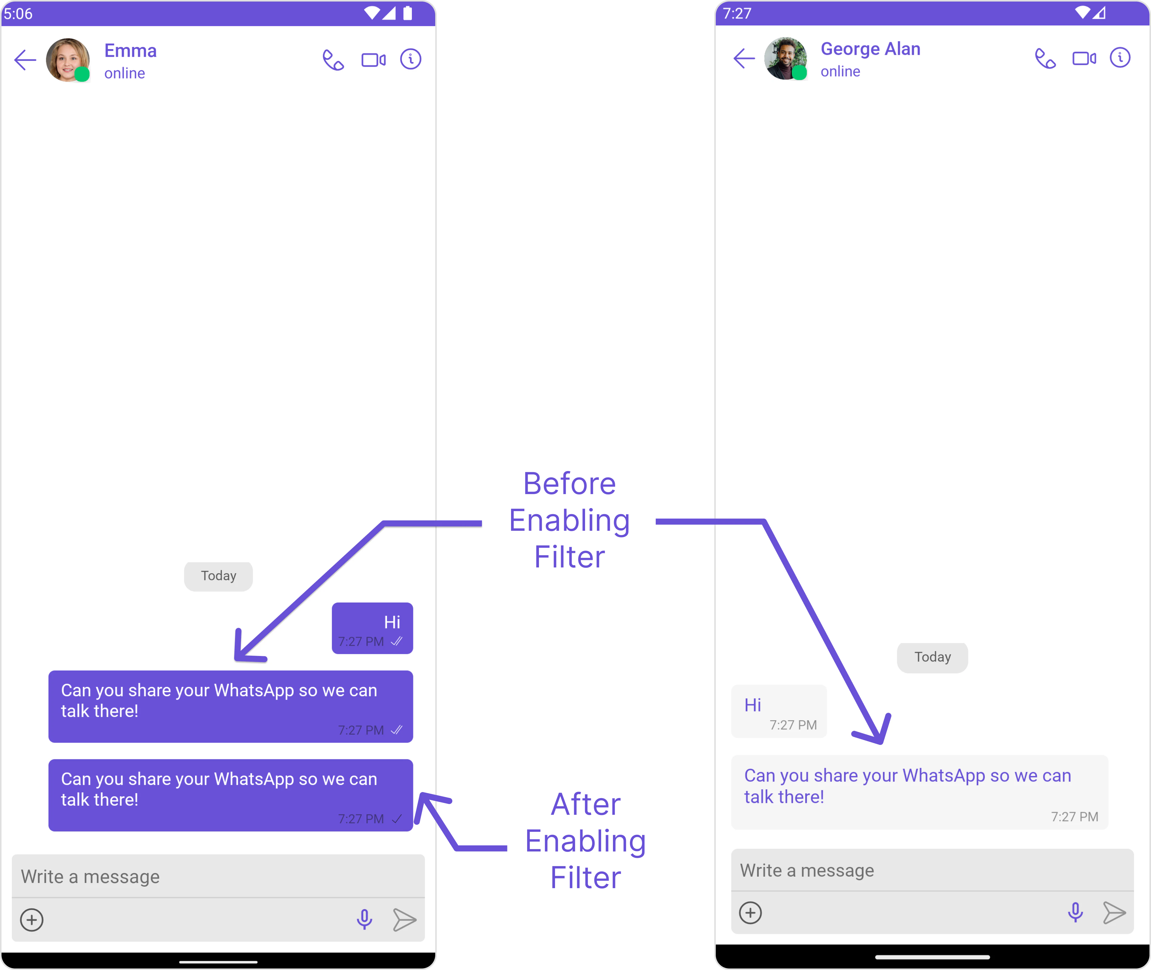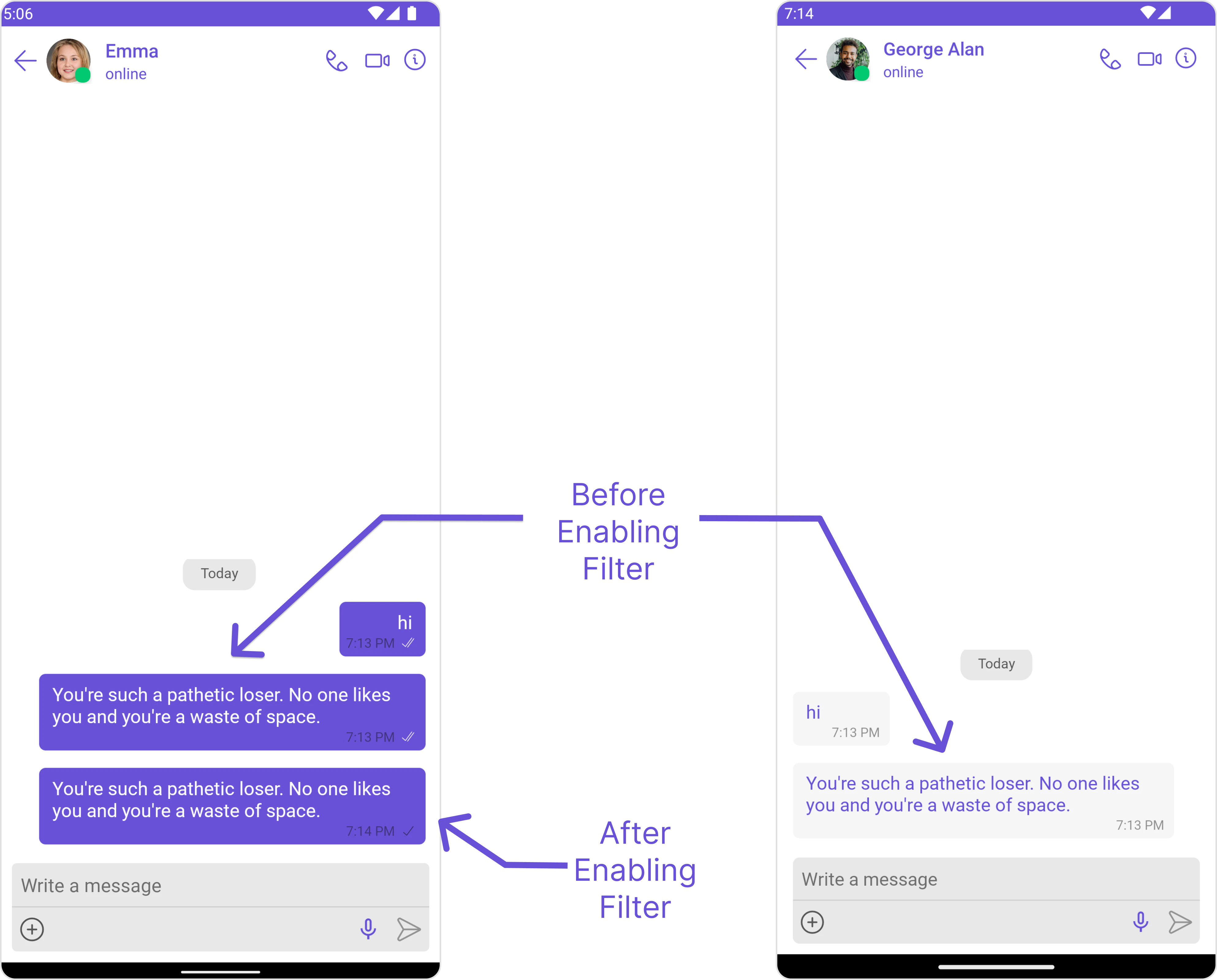 Automatically detects and blocks messages containing offensive language, profanity, or derogatory remarks using a predefined list of offensive keywords.Example: Before enabling, profane messages are delivered (double ticks). After enabling, they’re blocked (single tick).