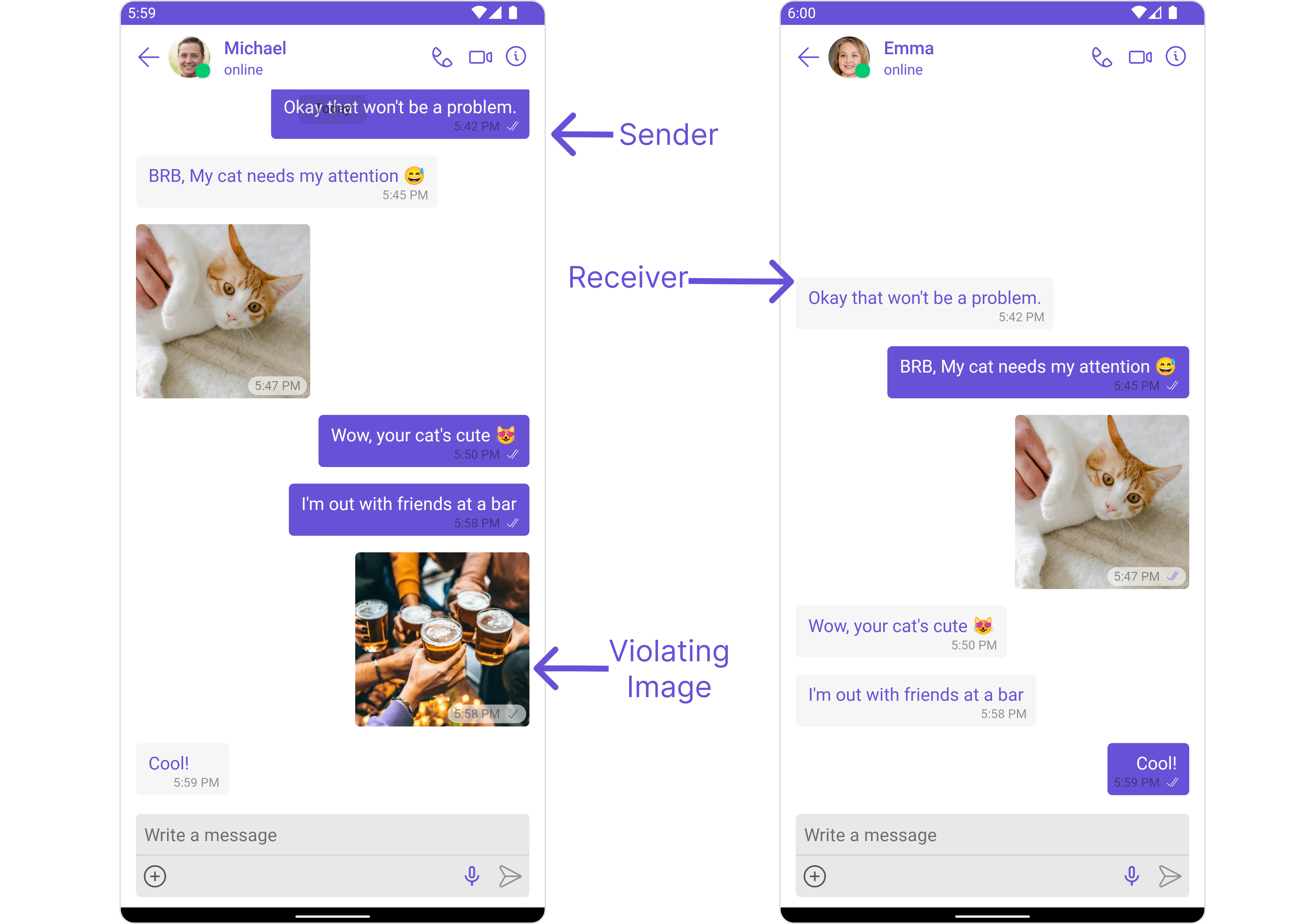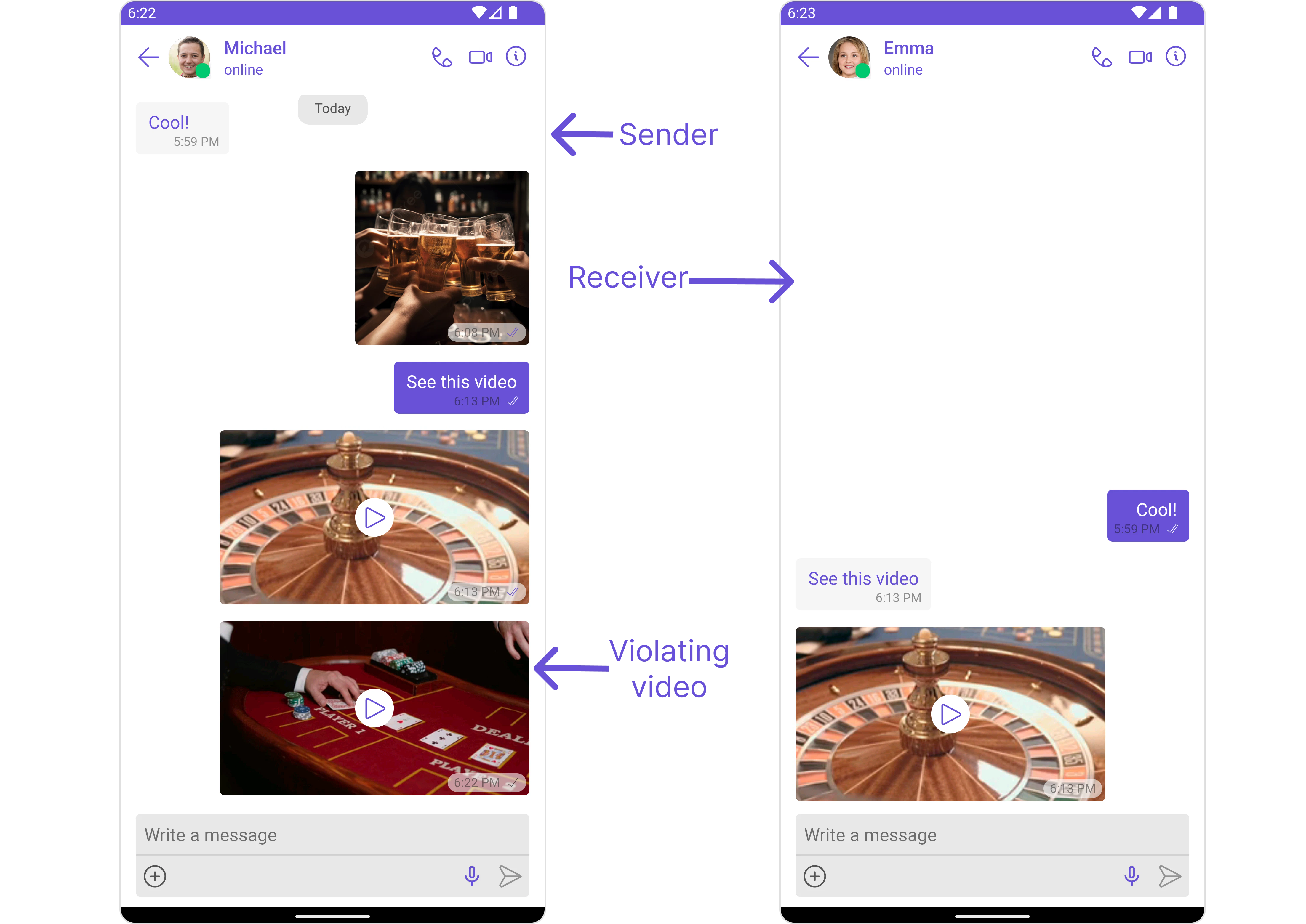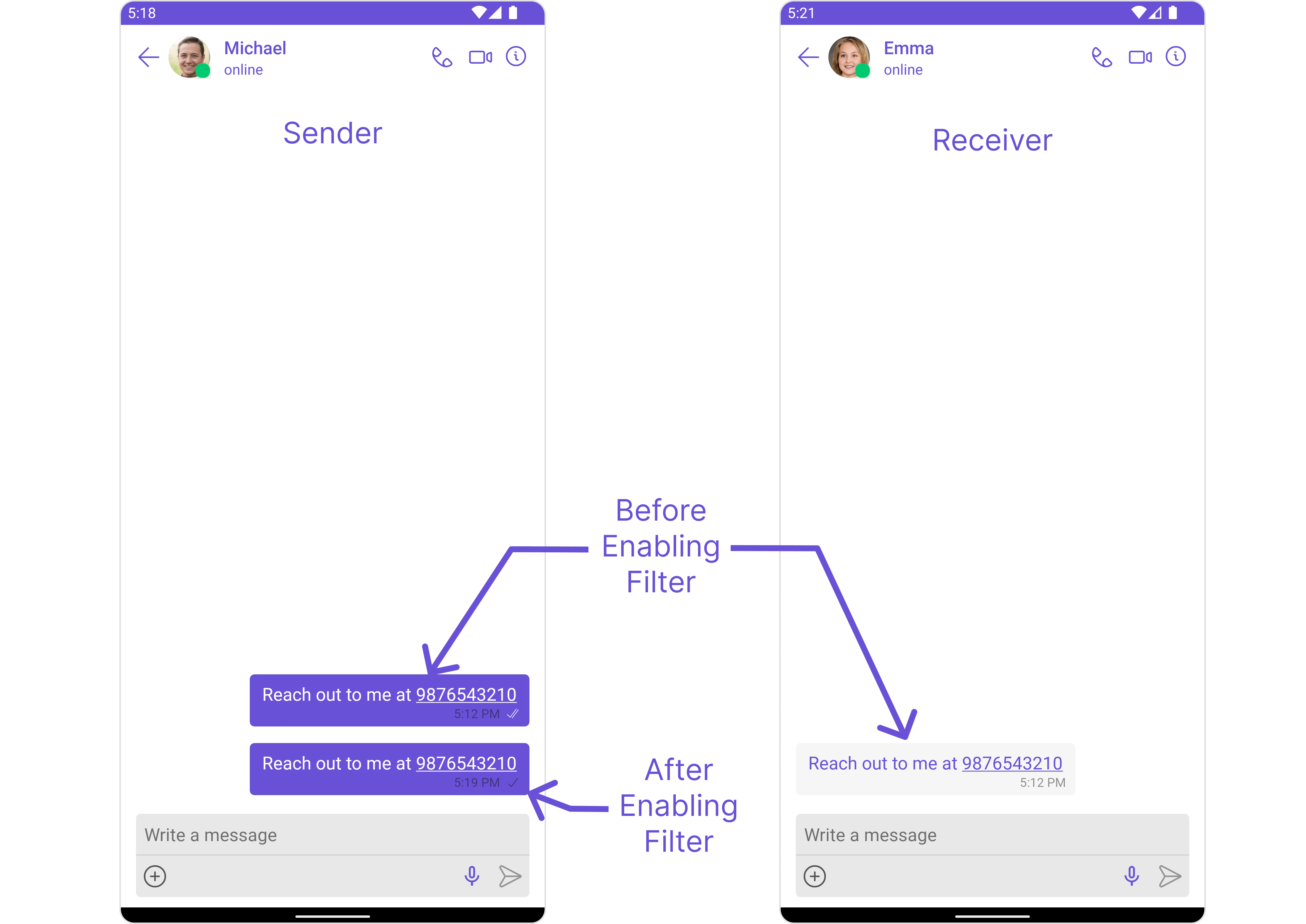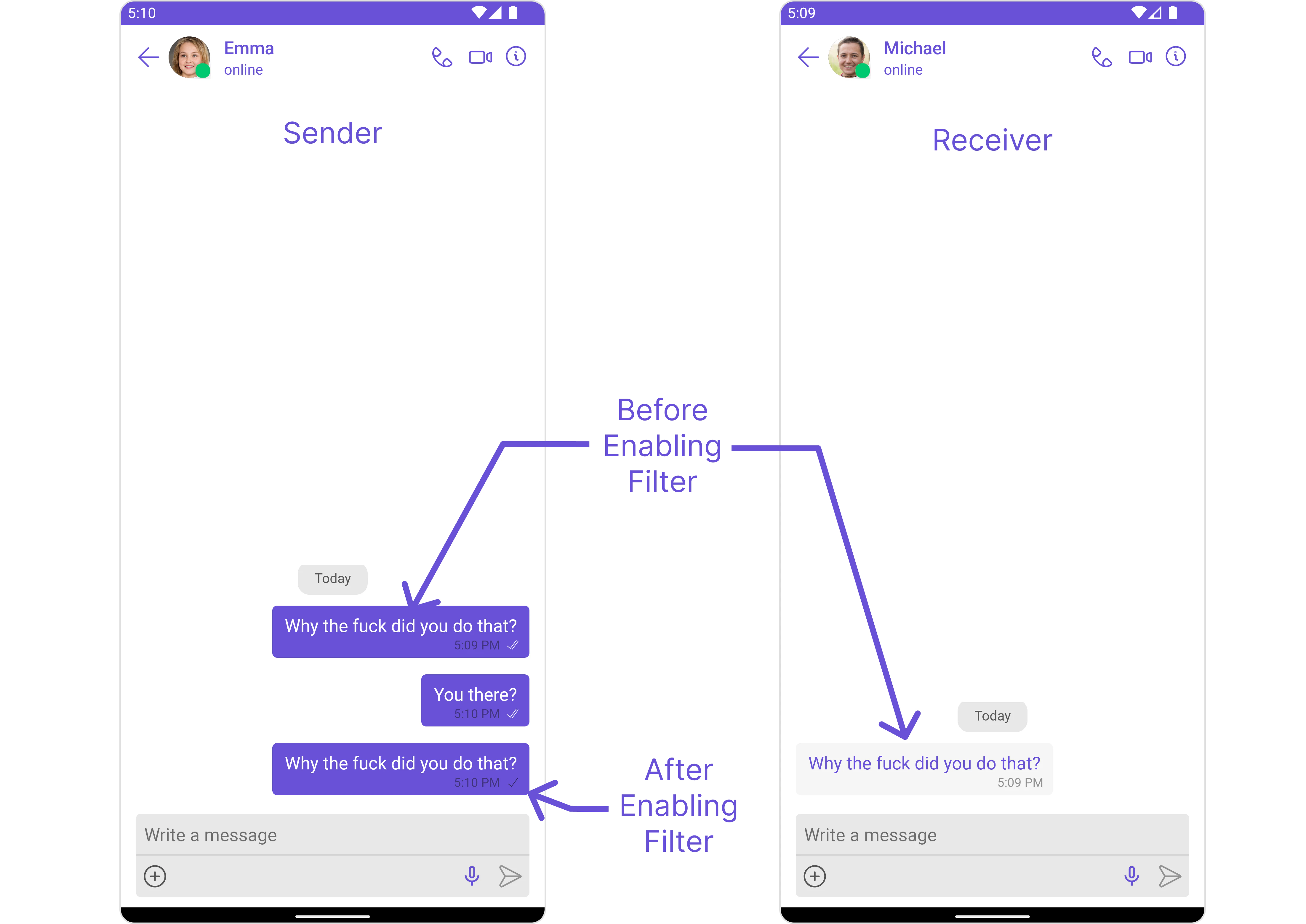 Automatically detects and blocks messages containing offensive language, profanity, or derogatory remarks using a predefined list of offensive keywords.Example: Before enabling, profane messages are delivered (double ticks). After enabling, they’re blocked (single tick).