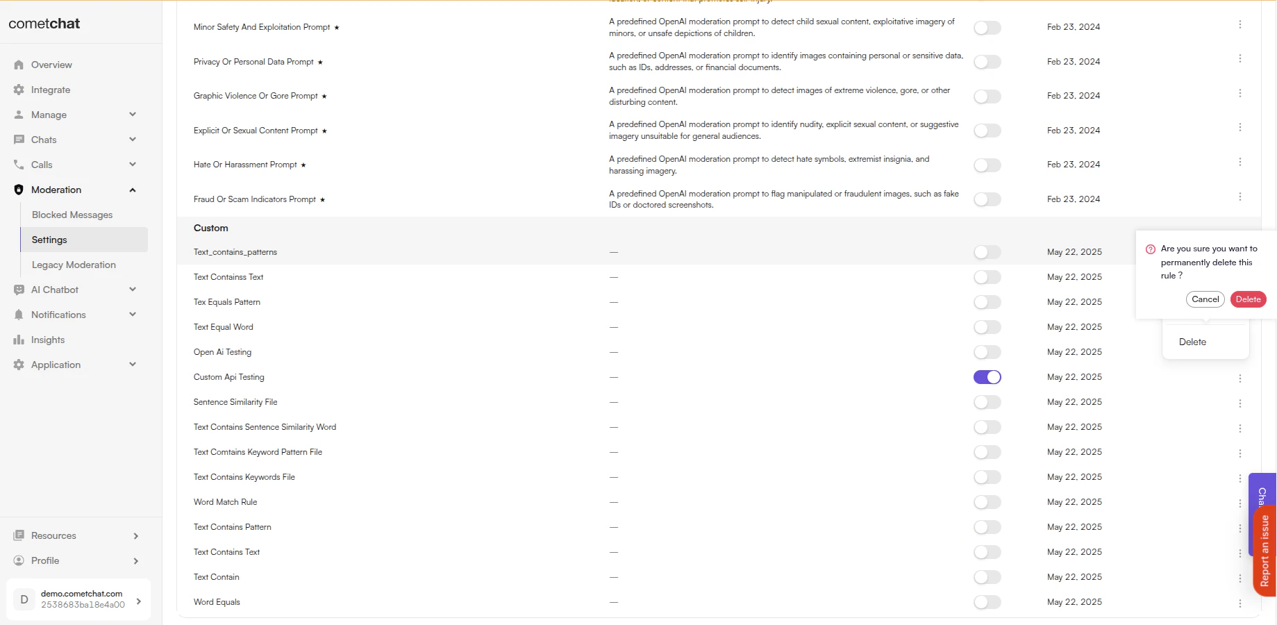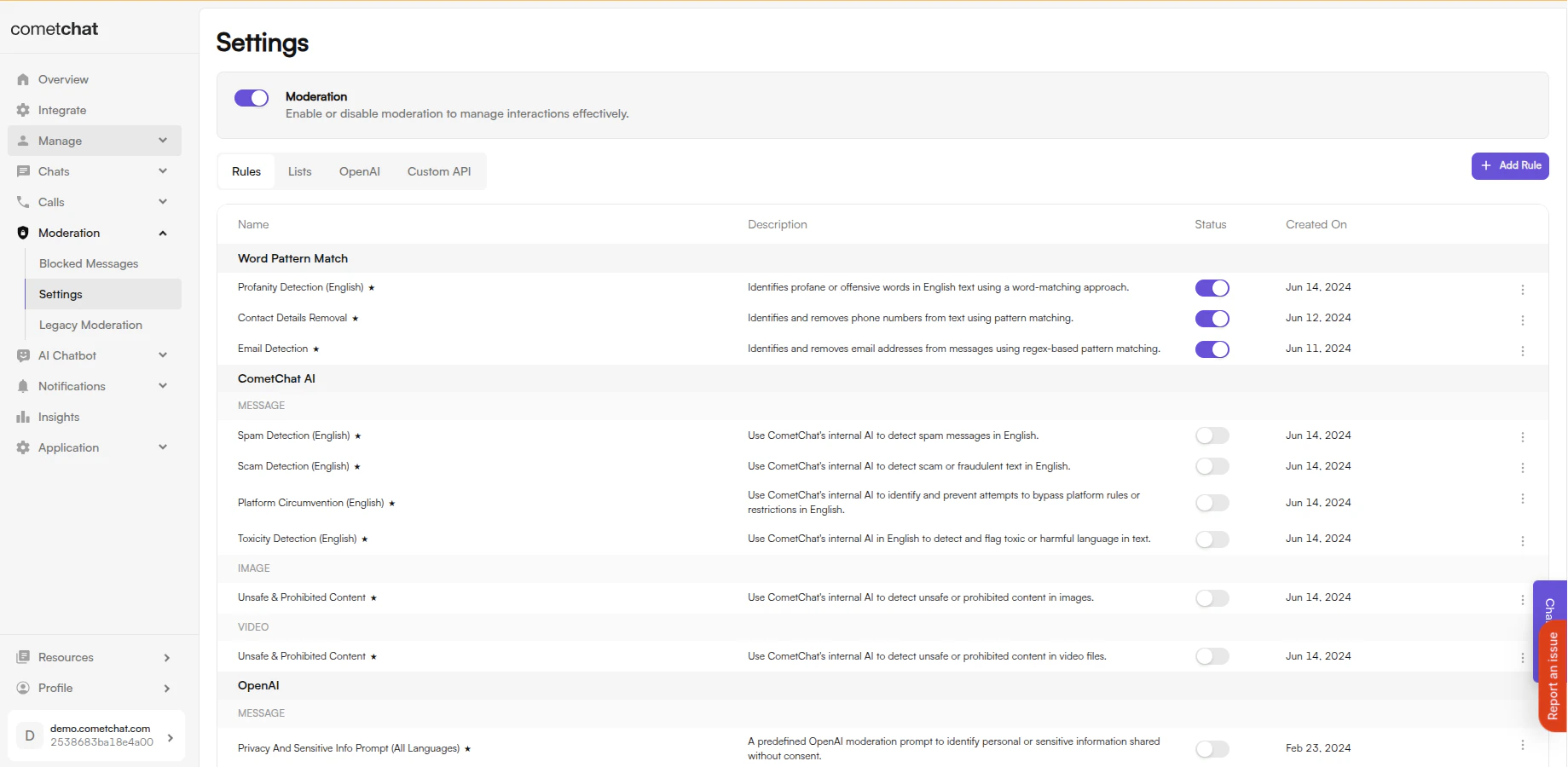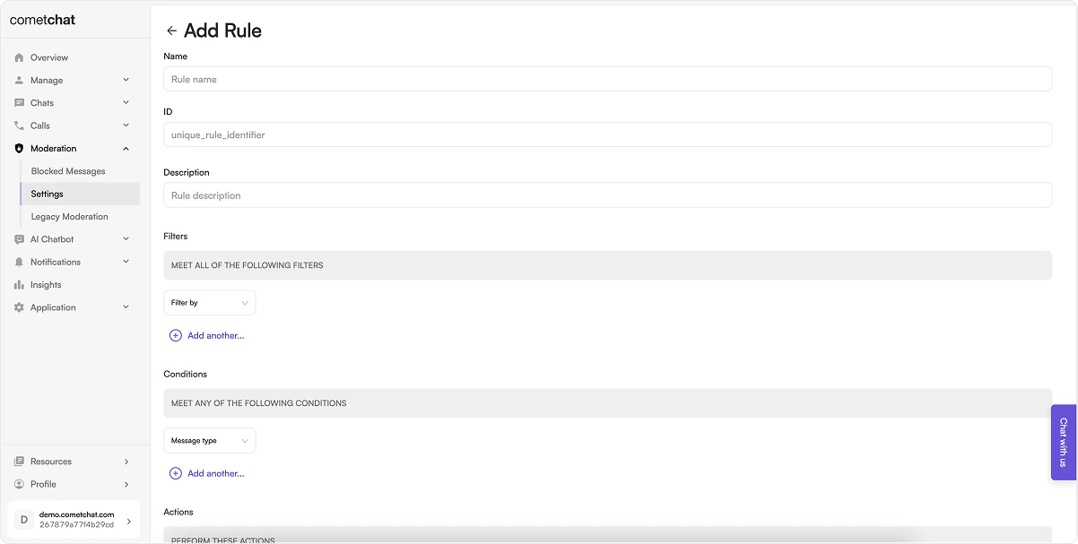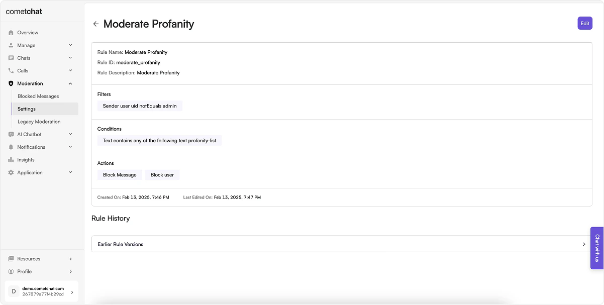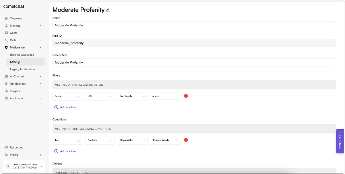 Login to CometChat Dashboard → Select your app → ModerationSettingsRules