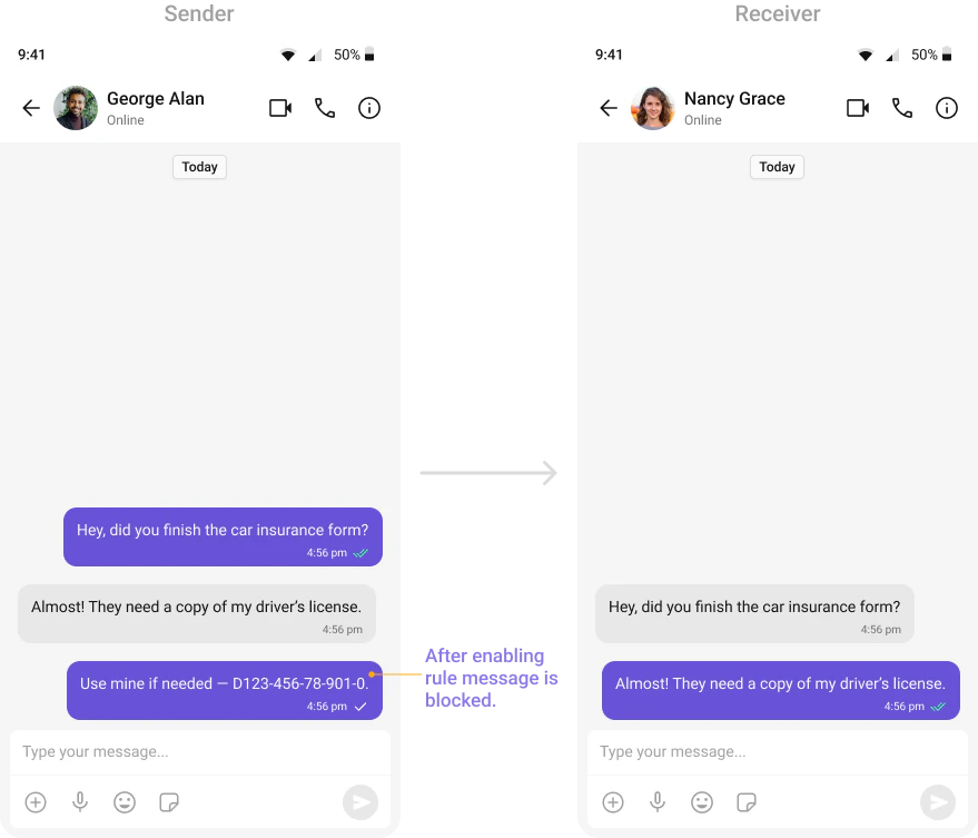 Detects and blocks messages containing phone numbers to prevent sharing of private contact information.