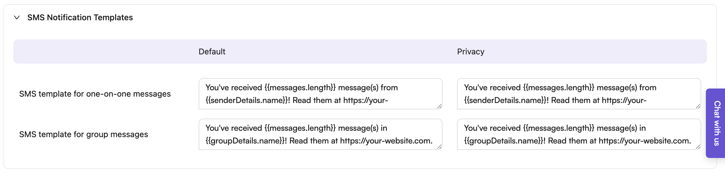| Group notification | You’ve received {{messages.length}} message(s) in {{groupDetails.name}}! Read them at https://your-website.com. | You’ve received {{messages.length}} message(s) in {{groupDetails.name}}! Read them at https://your-website.com. | You’ve received 2 message(s) in Hiking Group! Read them at https://your-website.com. |