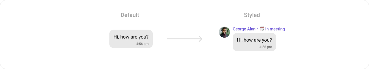 - Verify: Each text message bubble displays a custom header showing the sender’s name followed by ” • 🗓️ In meeting” in the primary color, replacing the default sender name header.