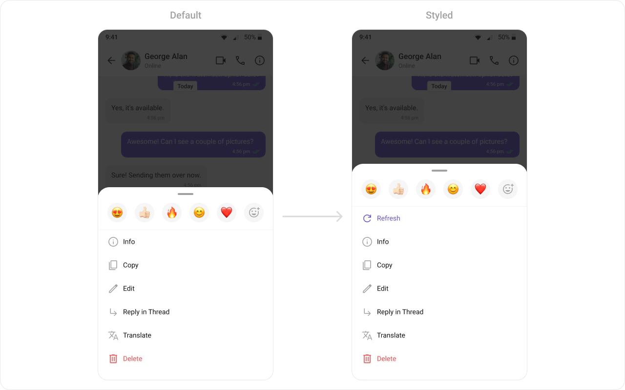 What this does: Creates a custom “Refresh” option usingCometChatMessageOptionwith an ID of"REFRESH", a label, an icon, and a click handler that shows a toast. This option is prepended to the default options list retrieved fromCometChatUIKit.getDataSource().getMessageOptions(), so the “Refresh” option appears first in the long-press action sheet for all message types.