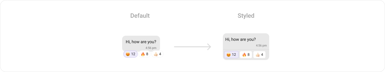 - Verify: Each message bubble displays a reactions bar in the footer area with a separator line above it. Sent message footers use the primary color background; received message footers use the neutral color background. Up to 4 reactions are displayed per message.