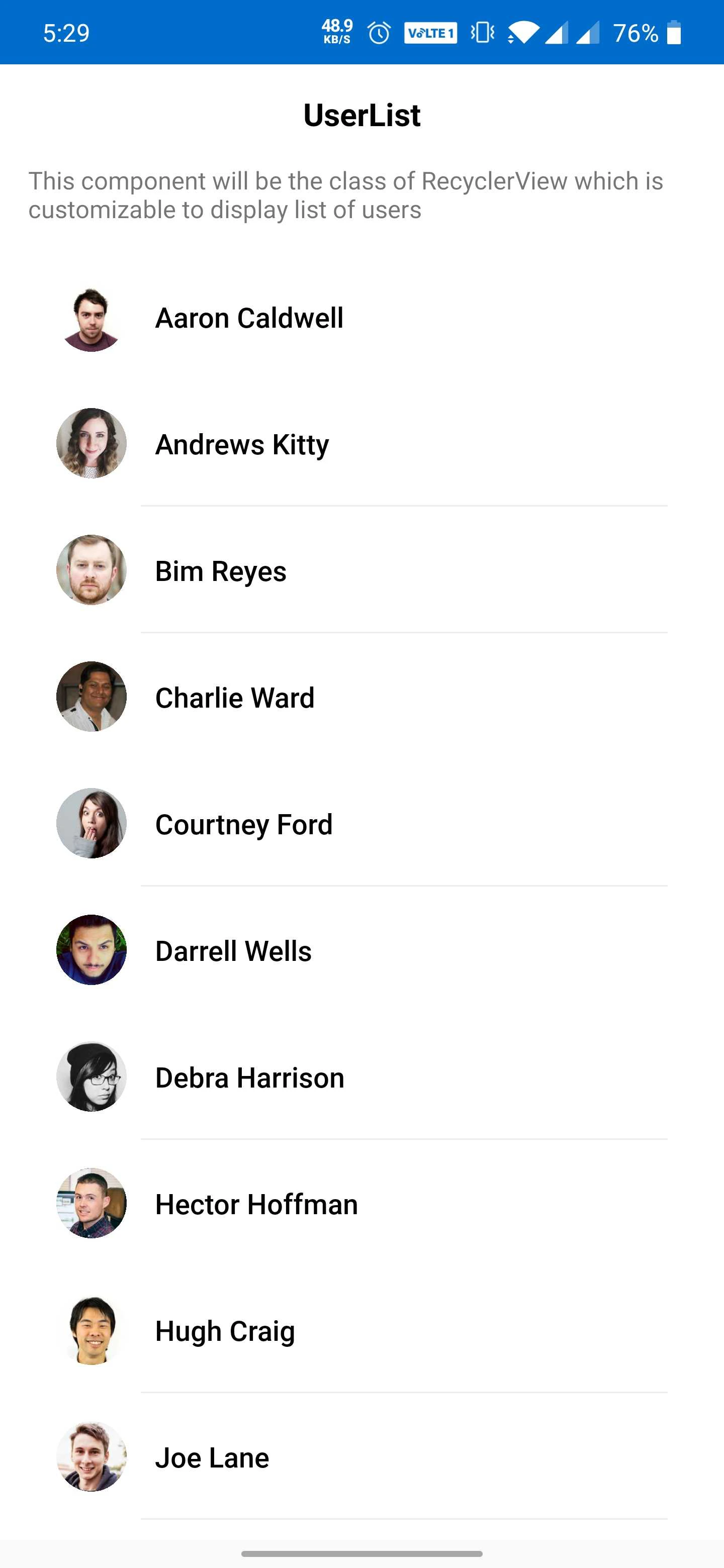 In your layout.xml add the following snippet to use the CometChatUserList. Adding the following code snippet will give you a fully working list of users.