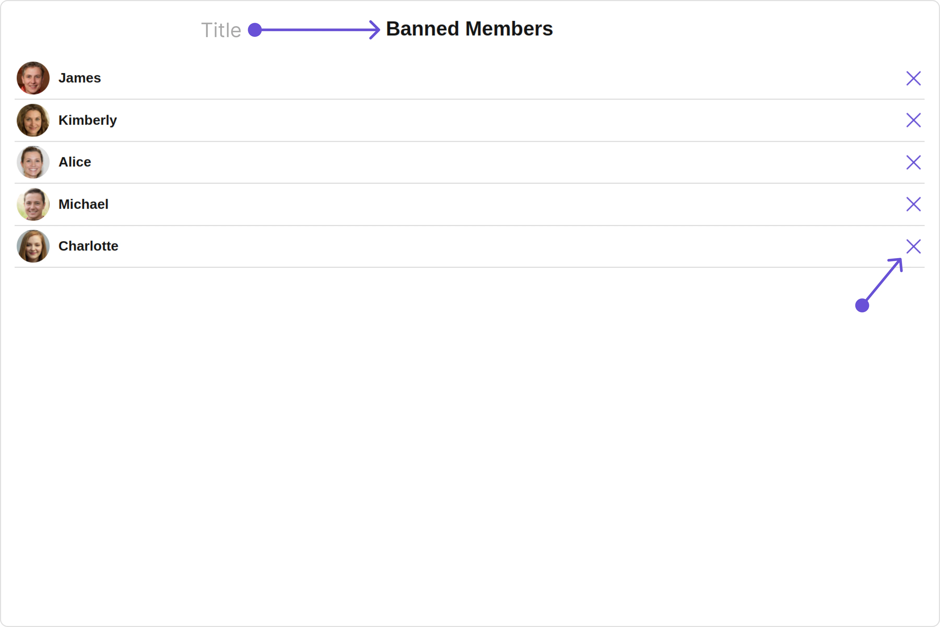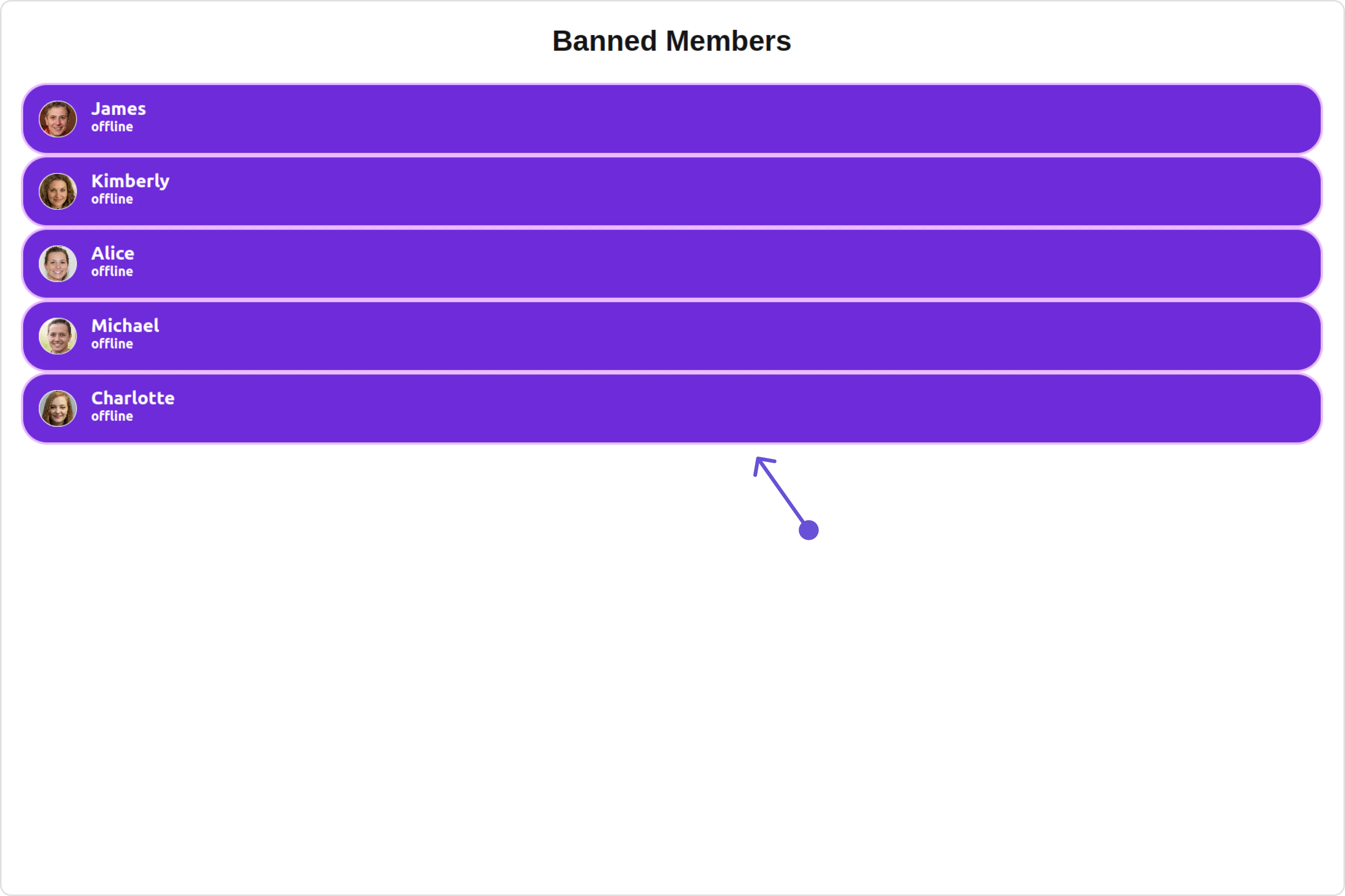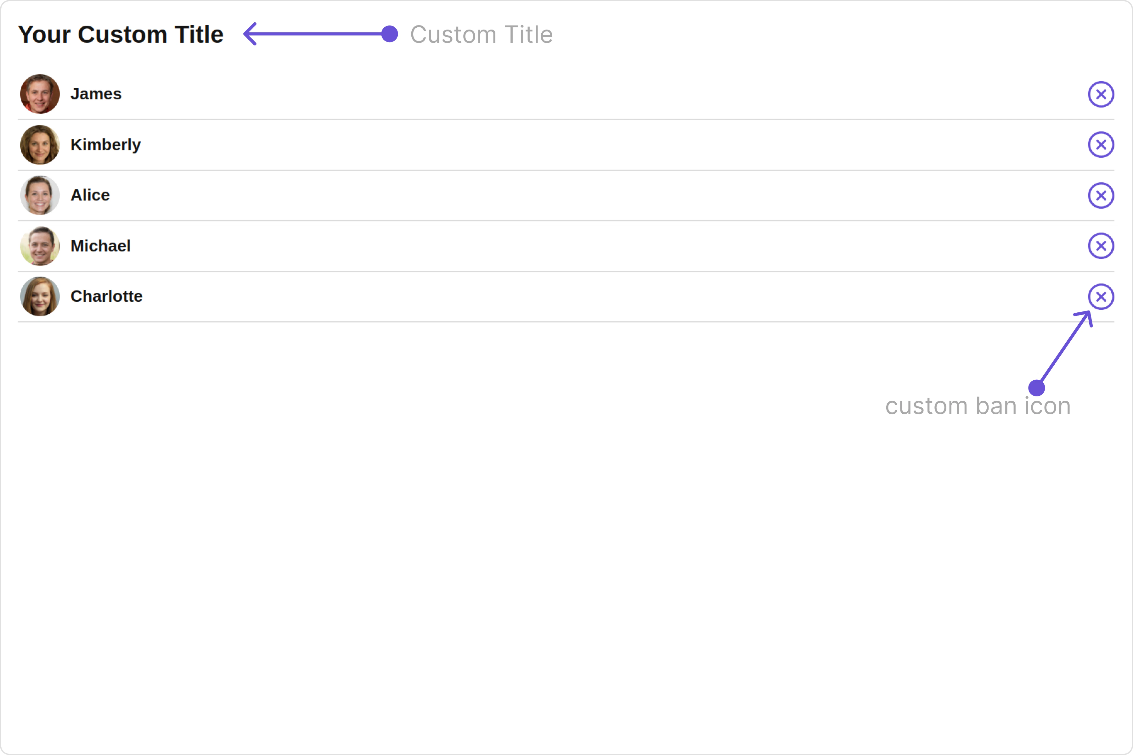 With this property, you can assign a custom ListItem to the Banned Members Component. Example Default: