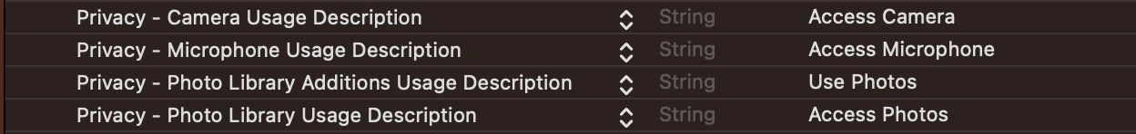 - Allow Camera, Microphone and photo Library access in Info.plist