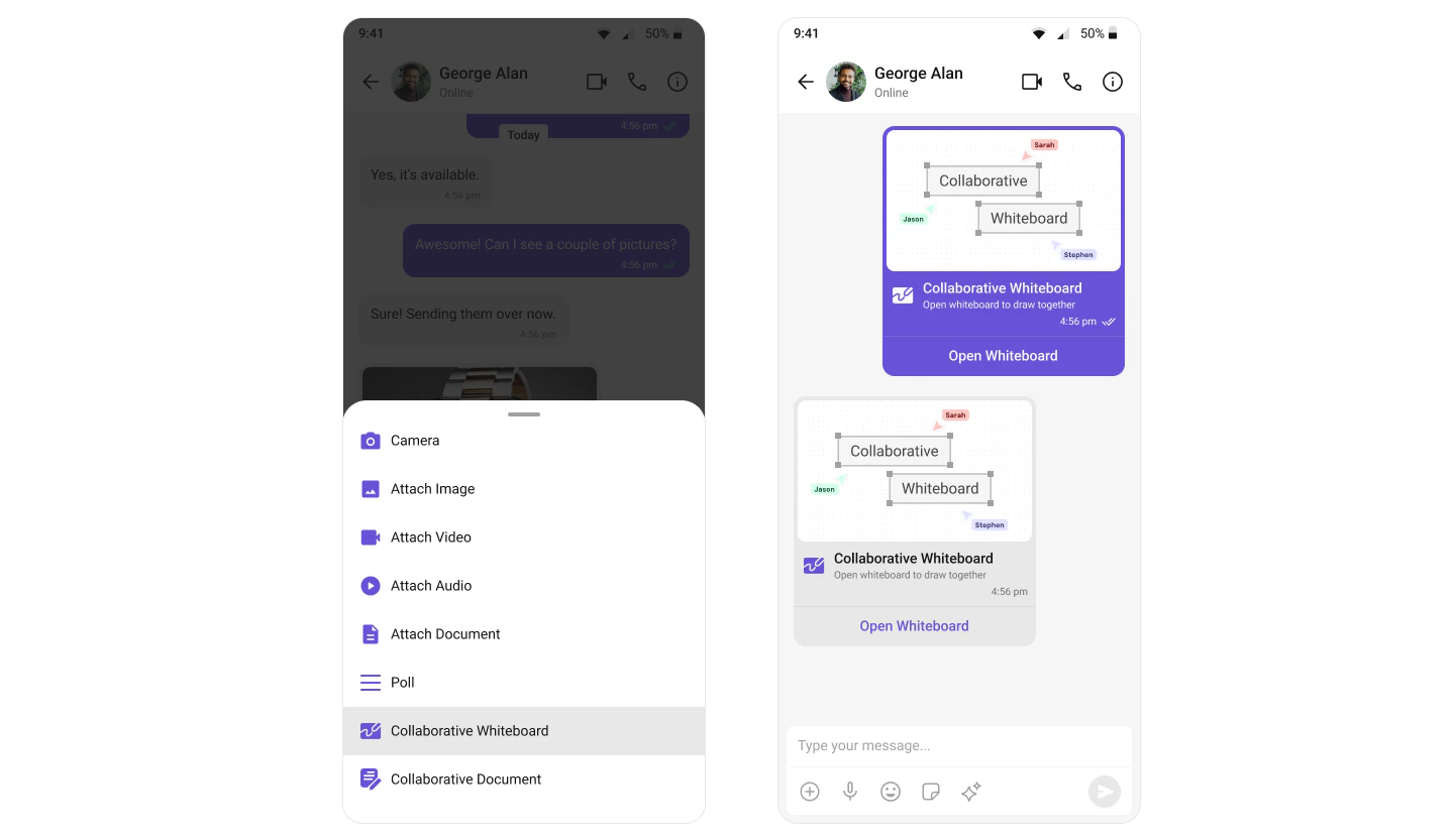 The Collaborative Whiteboard extension facilitates real-time collaboration. Users can draw, brainstorm, and share ideas on a shared digital whiteboard. For a comprehensive guide, refer to the Collaborative Whiteboard Extension documentation. Once you have activated the Collaborative Whiteboard Extension from your CometChat Dashboard, the feature will automatically be incorporated into the Action Sheet of the Message Composer component.