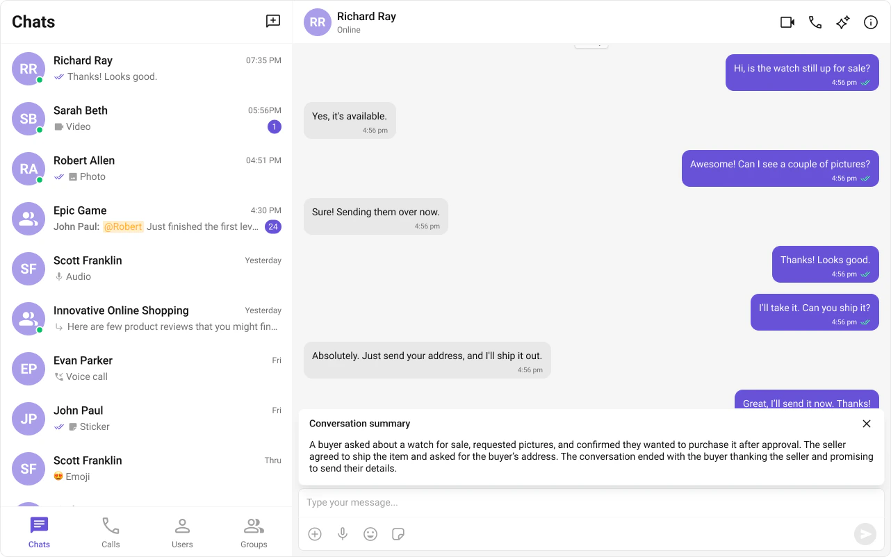 AI-generated recap of long conversations. See Conversation Summary. Auto-integrates into the Action Sheet of MessageComposer when activated.
