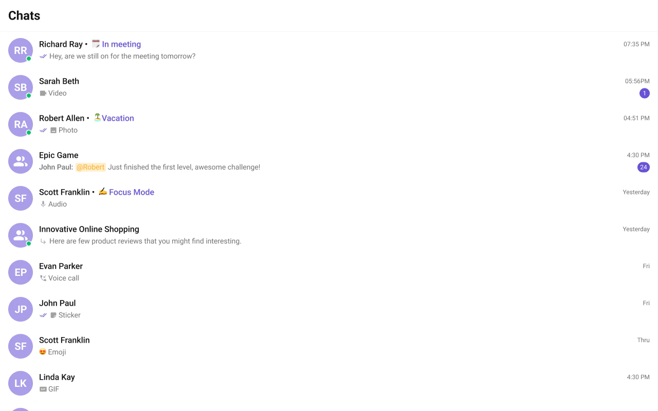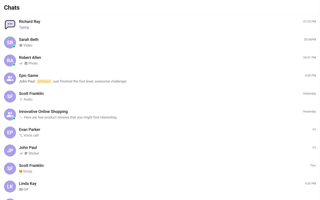 "description": "Scrollable list of recent one-on-one and group conversations for the logged-in user.",