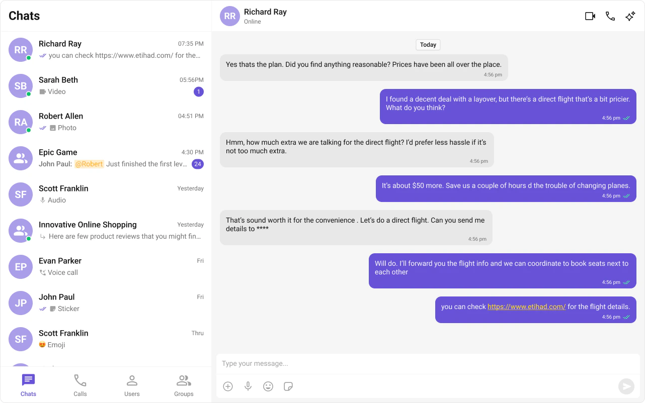 LayoutTabbed sidebar (Chats, Calls, Users, Groups) + message view