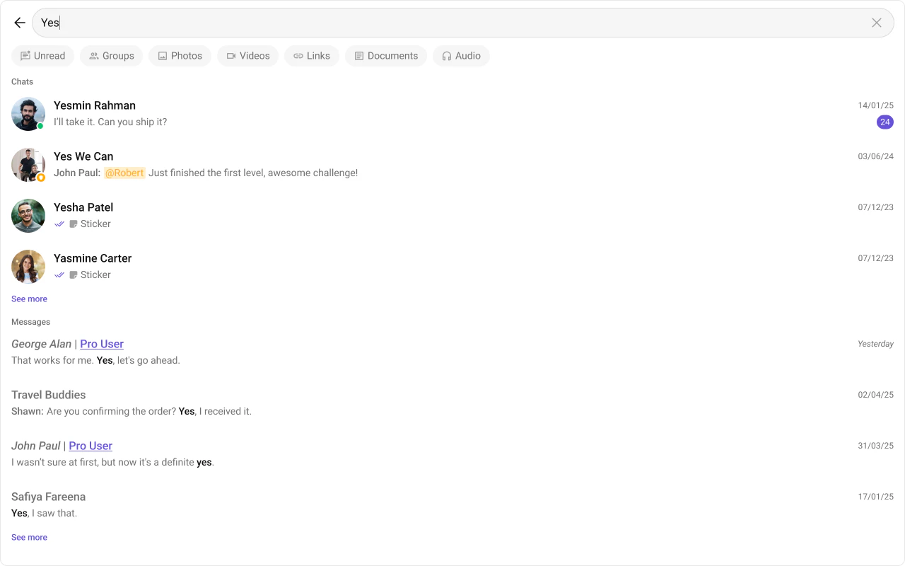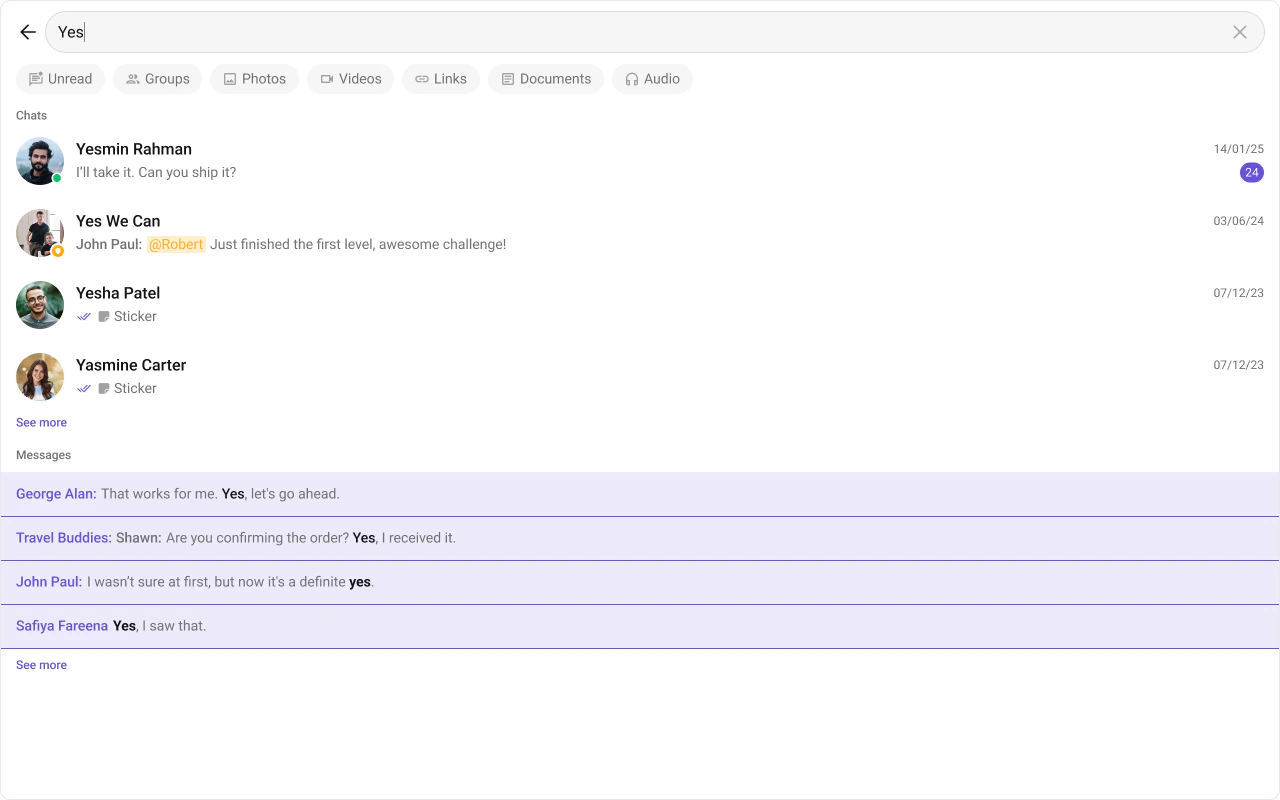 "flow": "User types query -> results appear in conversations and messages sections -> onConversationClicked/onMessageClicked navigate to result"