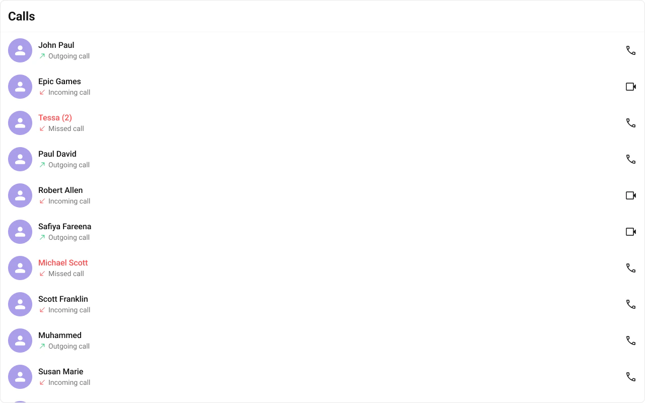 CometChatCallLogs is a Component that shows the list of Call Log available . By default, names are shown for all listed users, along with their avatar if available.